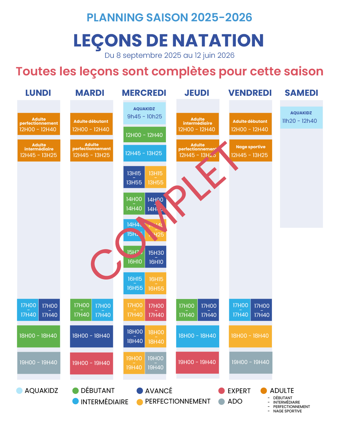 - Ouverture des nouvelles inscriptions le 17 juin 2025. Avant toute inscription, un test est nécessaire pour déterminer le niveau de l’enfant. Rendez-vous à la piscine à partir du 17 juin pour faire le test.